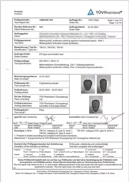 - EN 1621-1:2012 (Giáp vai/ tay/ đầu gối/ hông) – Level 1: Giảm lực tác động còn dưới 35 kN