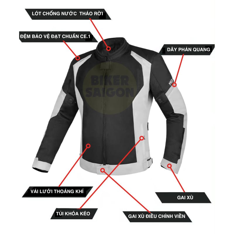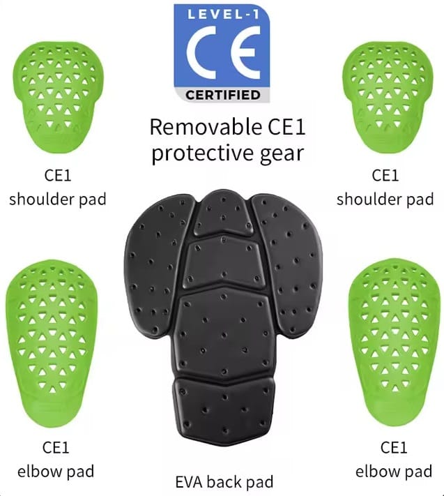 - Đệm bảo vệ tại các vị trí: vai, khuỷu tay, lưng đạt chuẩn CE level 1