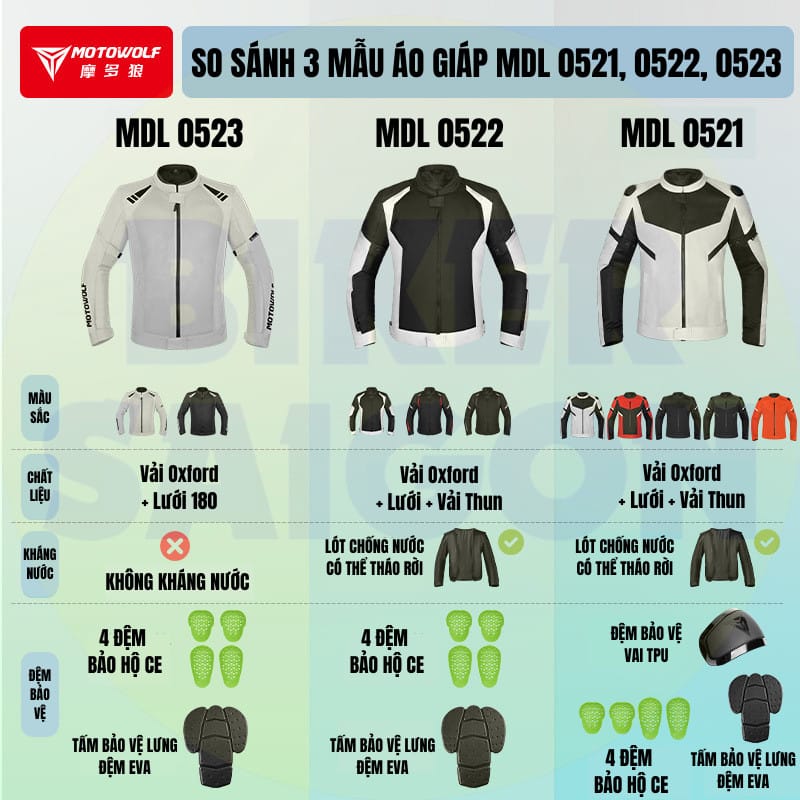 Bảng so sánh Áo Giáp Chống Nước Motowolf MDL 0521, 0522, 0523