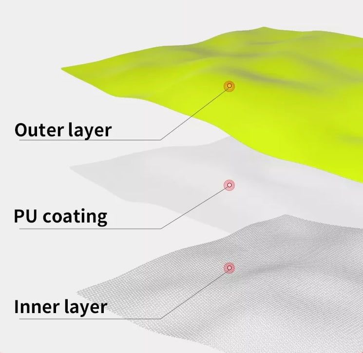 + Lớp ngoài mặt bên trong được phủ PU là phủ một lớp dính trên bề mặt vải. Nó tạo ra một lớp keo chống thấm nước, cao cấp giúp sản phẩm có khả năng chống nước và chống thấm cao.