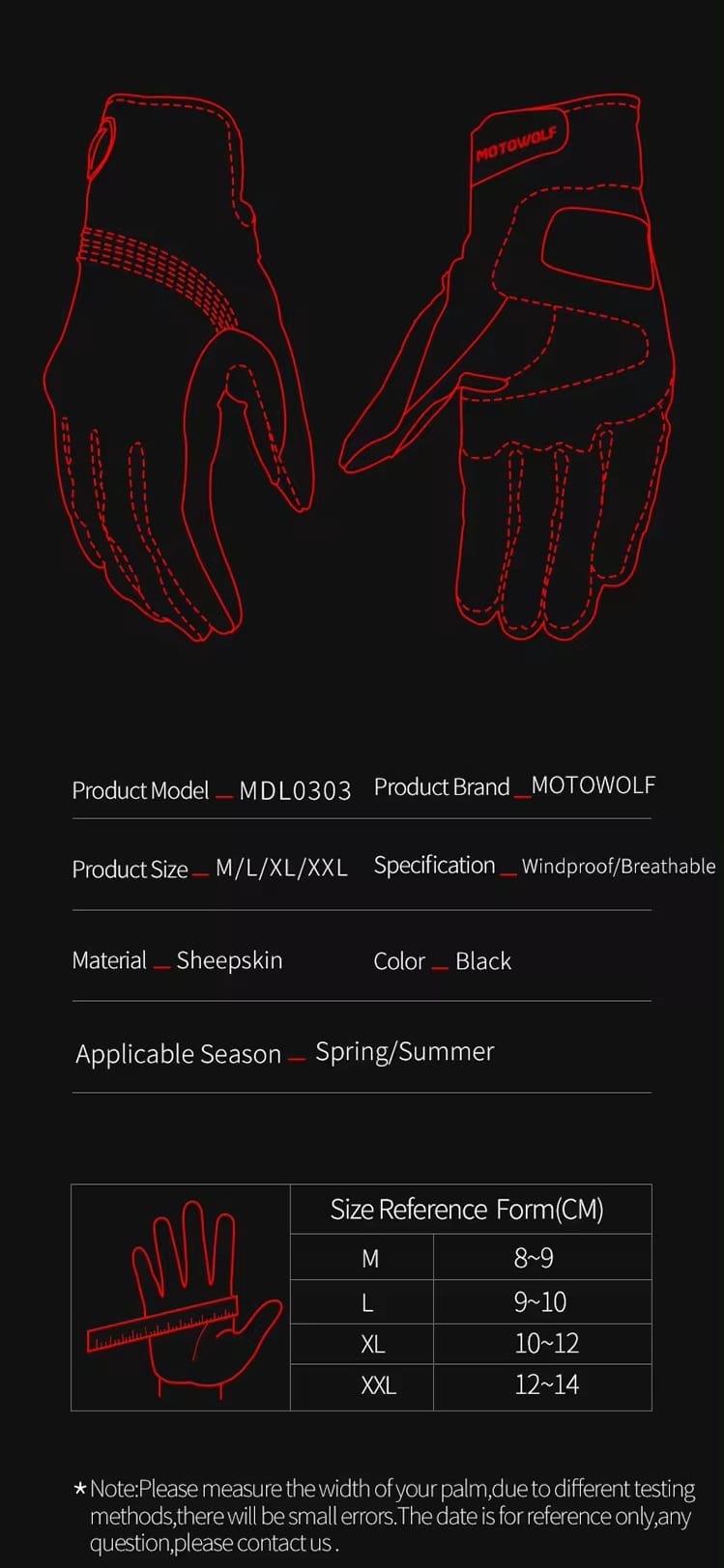 Găng tay Motowolf MDL 0303 được sản xuất với vật liệu 100% chính là Da cừu, lót bông 3M và đệm bảo vệ PVC. Đây là sản phẩm được đánh giá khá cao tại các thị trường châu Á khác về khả năng bền bỉ và bảo vệ siêu tốt.