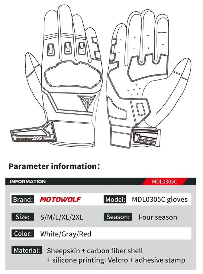 Găng tay Motowolf MDL0305C được sản xuất với vật liệu chính là Da cừu, bông 3M, Nylon, Sợi carbon bọc nhựa và đệm TPR. Đây là sản phẩm được đánh giá khá cao tại các thị trường châu Á khác về khả năng bền bỉ và bảo vệ siêu tốt.