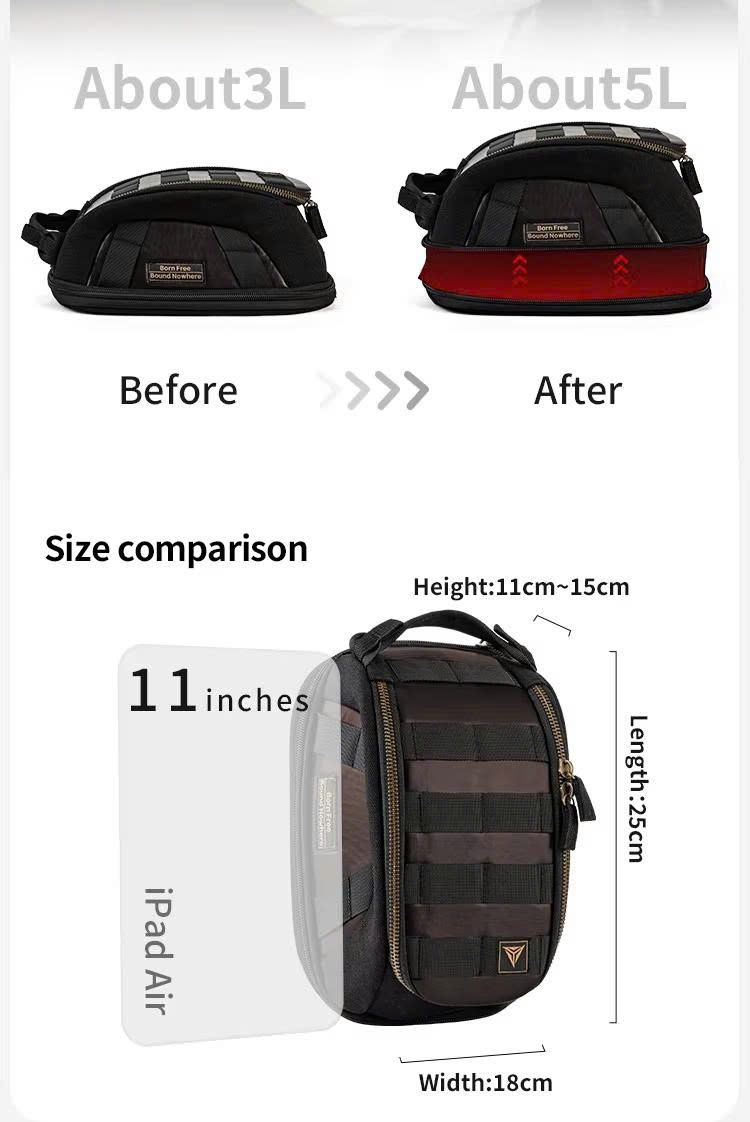 Túi Hít Bình Xăng Motowolf MB11 với dung tích 3L và có thể mở rộng lên đến 5 lít cùng bộ thông số kích cỡ là 11-15X25X18cm (11inch). Với kích cỡ này, anh em có thể thoải mái mang theo các vật dụng cá nhân như ipad air, điện thoại, ví, chìa khóa, sạc dự phòng, găng tay,…